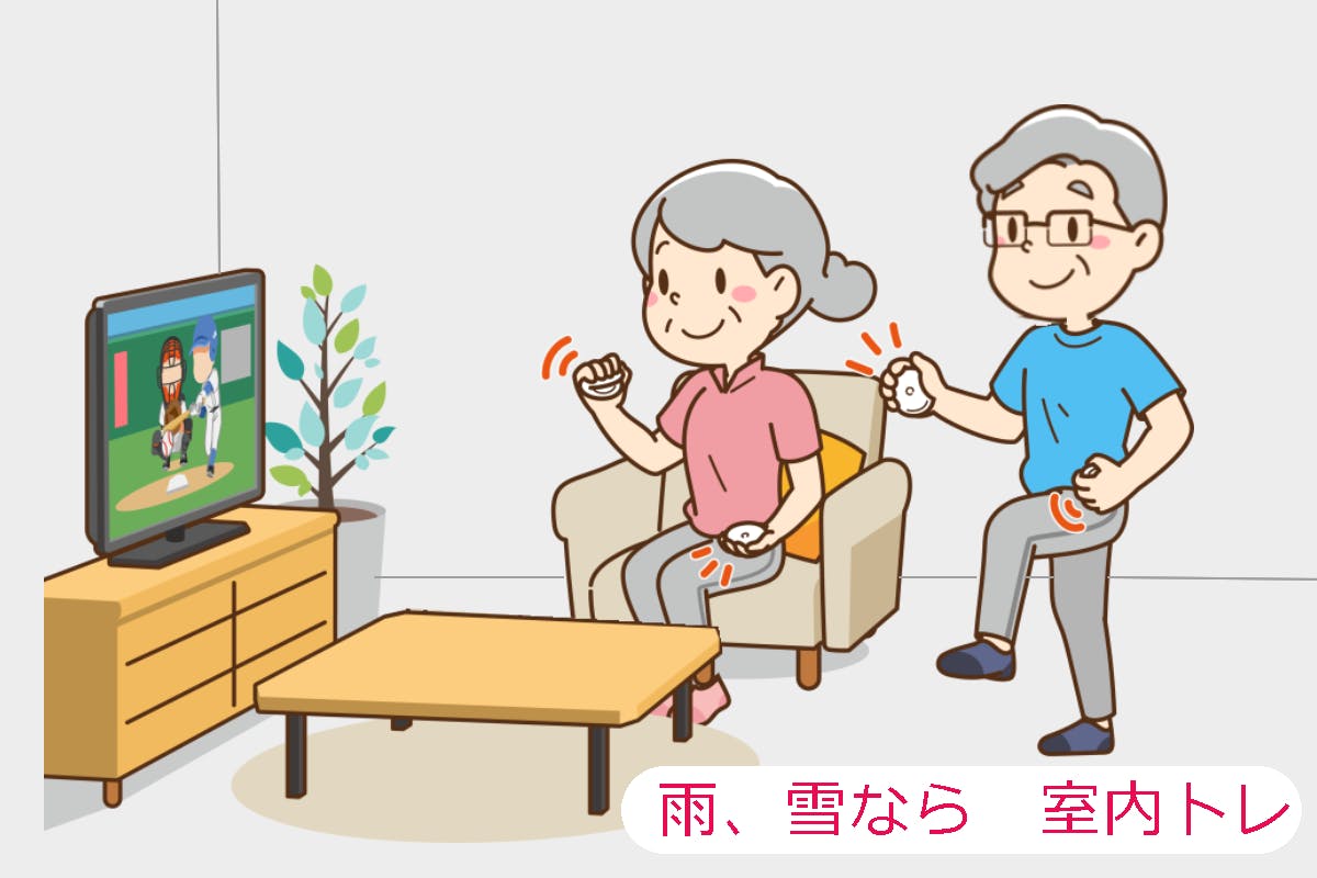 外への散歩に身体的に自信が持てない方や療養中の方は体調に相談の上、室内で無理のないトレーニングができます。ダンベル動作や直立片足上げ運動。 今日は雨、雪なら室内トレーニングも、手足はしっかり動かせます。歩くこと、歩けることが健康高齢者への基本です。