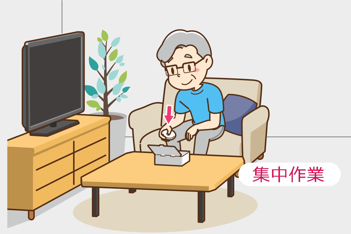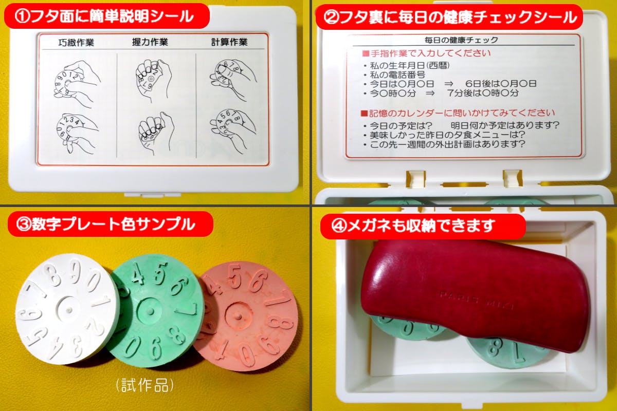 テレビを消して、集中してみる。収納ボックス蓋裏面の「毎日健康チェックシール」を操作したり、加減乗除の計算を自ら出題して指タッチの暗算方式で回答を繰り返します。この作業は手指の巧緻動作に計算機能を併用させた作業で判断力や記憶力の低下をサポートします。※毎日健康チェックシールは後記のこだわり・特長に表記しております。