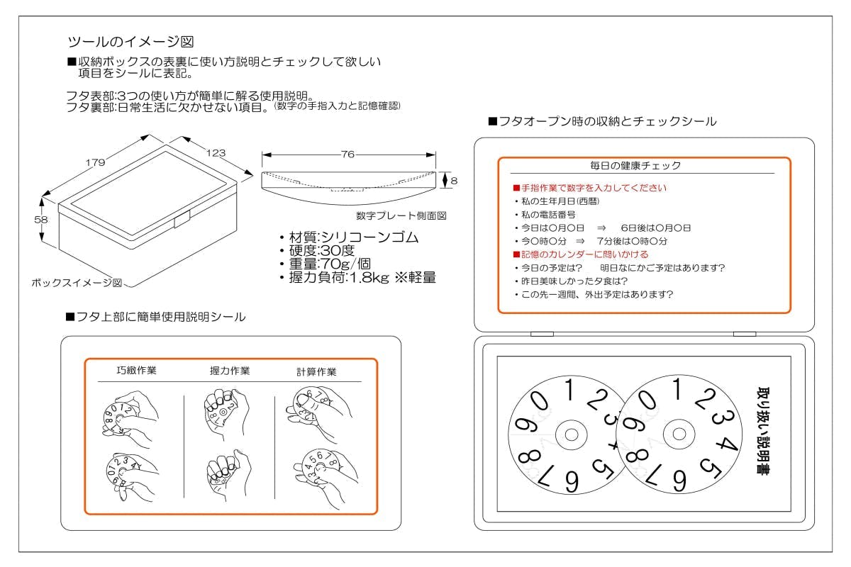 ③数字プレートはシリコーンゴムを採用しました。硬度は30度で柔らかくて触ったら人肌感があり馴染みやすく、いつまでも持っていたい感覚になります。このツールで触りながら頭を使い、考えながら五指を動かし同時に手指の握力運動ができます。