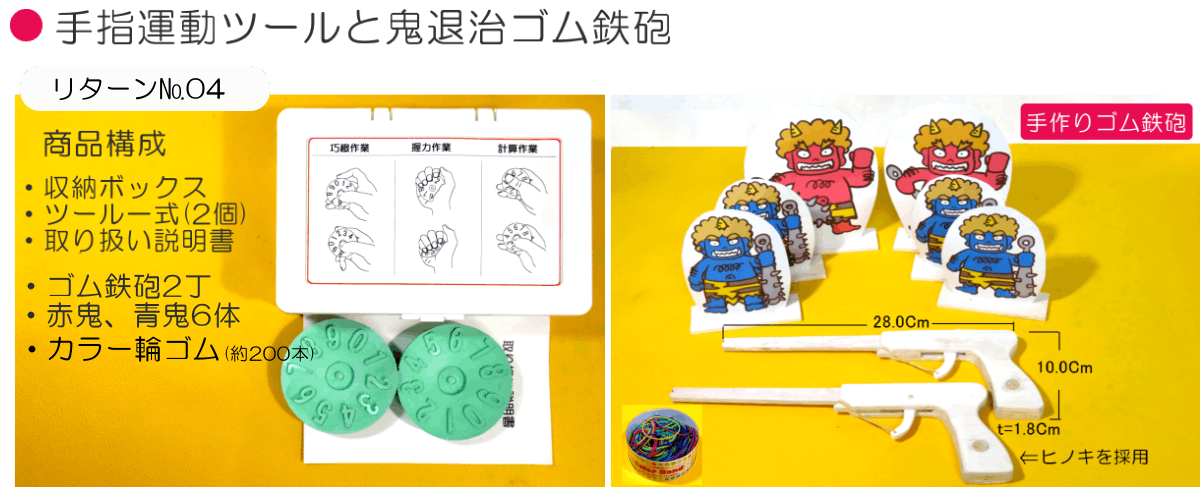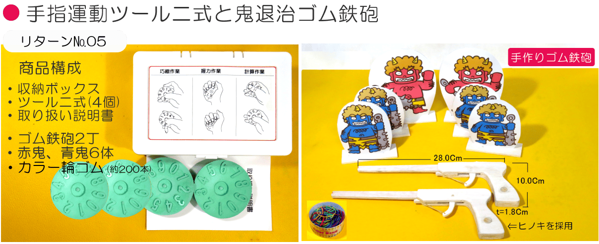 ■もう一つのリターン 【手指運動ツール+手作りゴム鉄砲】 (鉄砲2丁+青鬼赤鬼6体+カラー輪ゴム1缶)