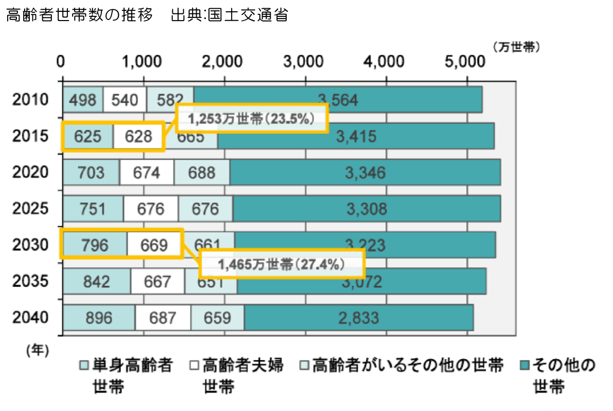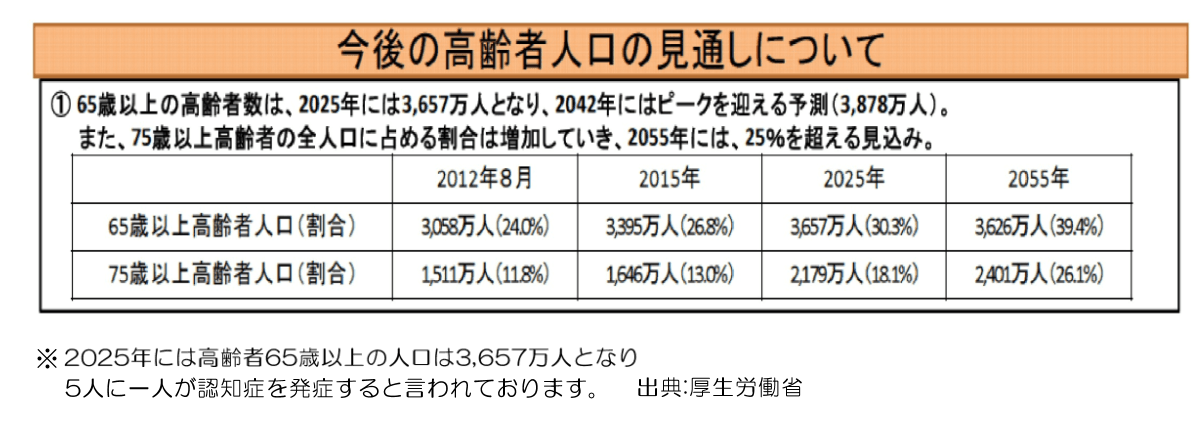 単身高齢者及び高齢者夫婦世帯(65歳以上)が2025年には1,427万世帯(26.4%)とあります、しかも増加するデータとなっており高齢のご両親や離れて生活をしているご両親が気になるところです。老々介護の問題もこの数字によってうかがえ知れます。