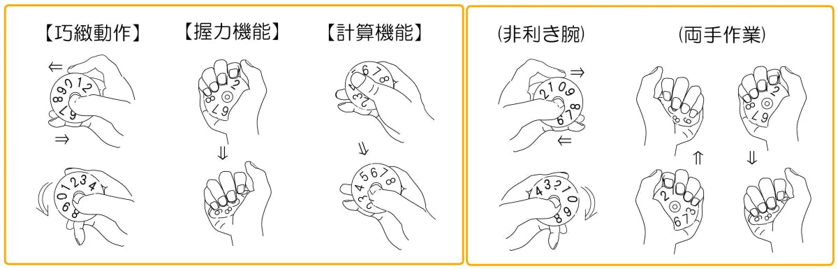 このツールは手指運動を重点に認知機能に役立つ「巧緻動作」「握力機能」「計算機能」の3つの特長を持たせております。この3つの機能を組み合わせて日常のチョットとした時間に、例えば(テレビを見ながら、会話をしながら、また、散歩をしながら)等のながら作業で出来ることや、集中力を必要とする作業にも対応しております。このツールは準備も不要で身近に置いておけば以下のようなシーンでご使用いただけます。※「巧緻動作」とは、手指の細かい運動をすることによって脳への活力を与えること。