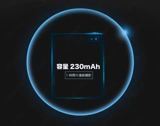 230mAhのバッテリーを搭載しており、60~70分間の連続撮影、約1週間の待機が可能です。付属のUSBケーブルを接続しながら撮影もできるので、撮影時の電力不足を心配する必要はありません。
