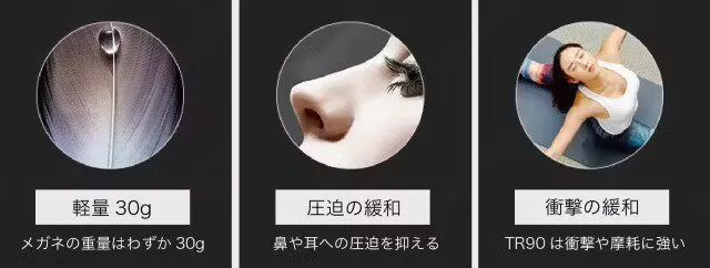 フレーム素材はタフ性の良いTR90を採用しており、衝撃や摩耗に強いです。メガネの重さはわずか30gで、鼻や耳への圧迫を緩和します。