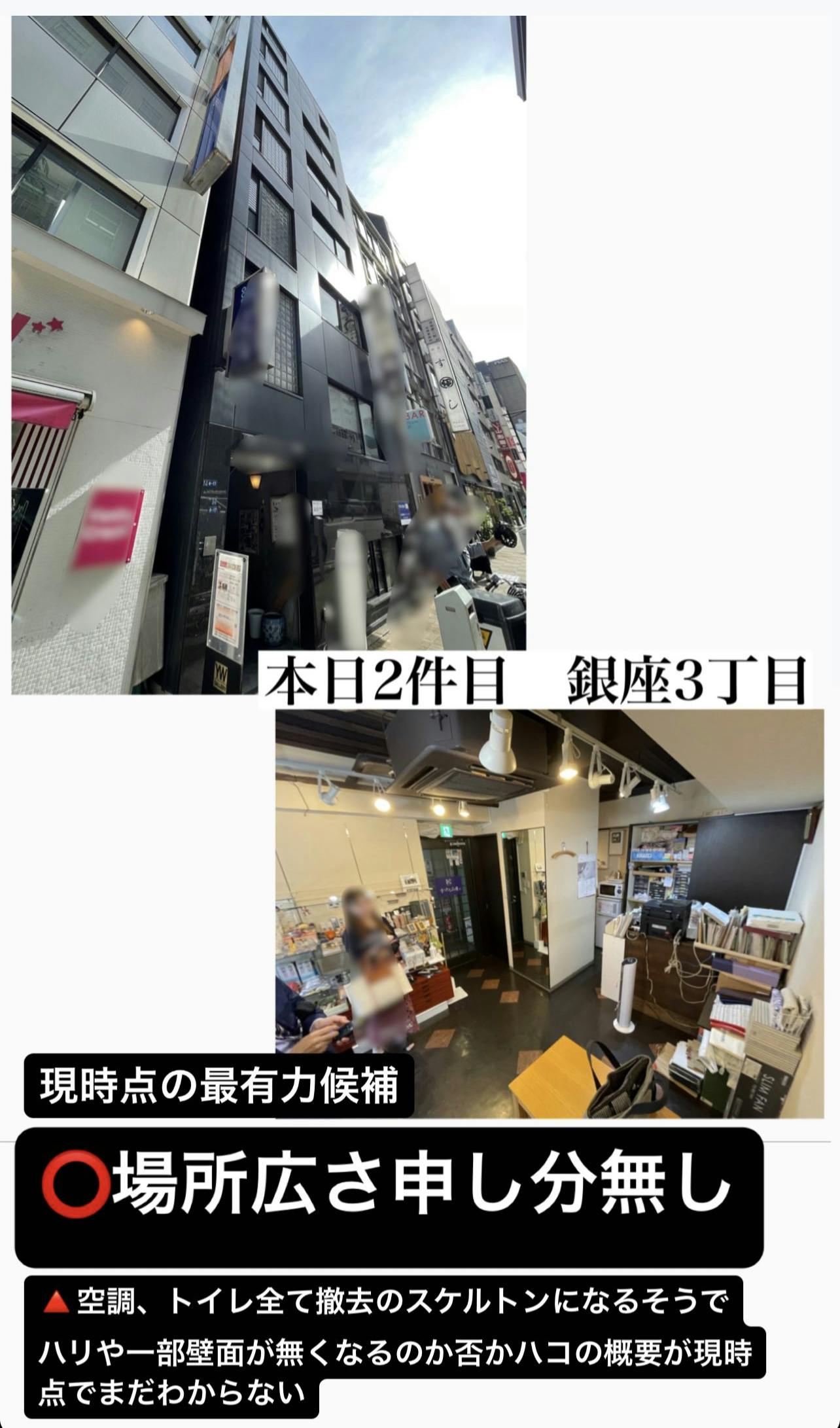 2023/10/03 15:26銀座3丁目物件になります広さ場所は申し分無しです定借の契約に付き詳細を再確認現在お願いしております。現在まだ営業中の物件に付き、実際退去時は完全なスケルトンになるそうで、現状トイレやハリの囲い等が無くなった環境をまだ把握する事が出来ず、まだ確認することがありますが立地や2階と言った部分などかなり理想的な物件でした。一旦の活動報告まで もっと見る