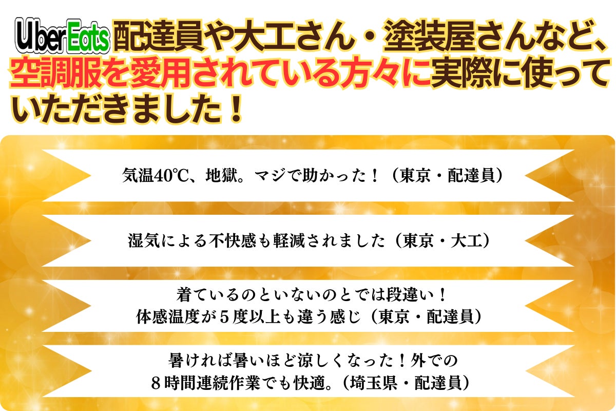 Ubereats配達員・塗装屋さん・大工さんからスーパーにお買い物に行くお母様方、一坪農園を楽しまれている方なんかも、空調服を愛用されています。