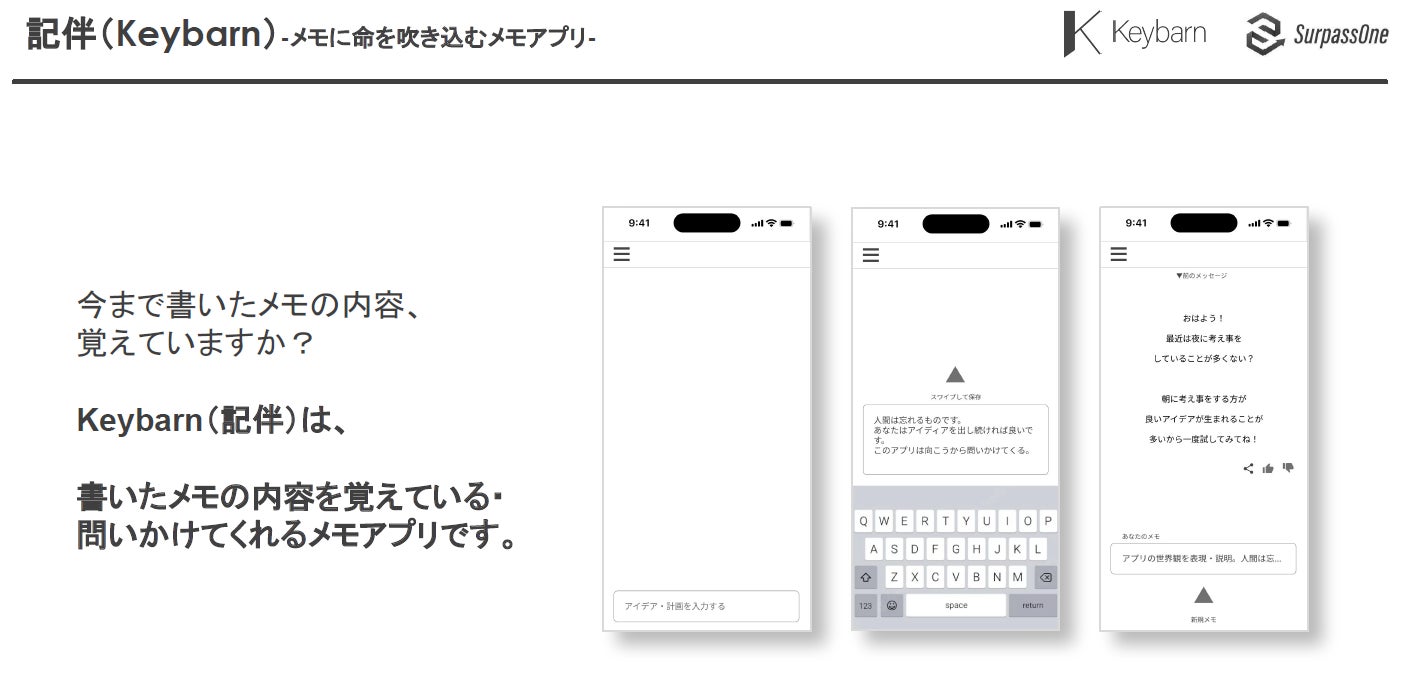 Keybarn(記伴)とは、メモ機能×ChatGPTの技術を掛け合わせた、メモに命を吹き込むメモアプリです。