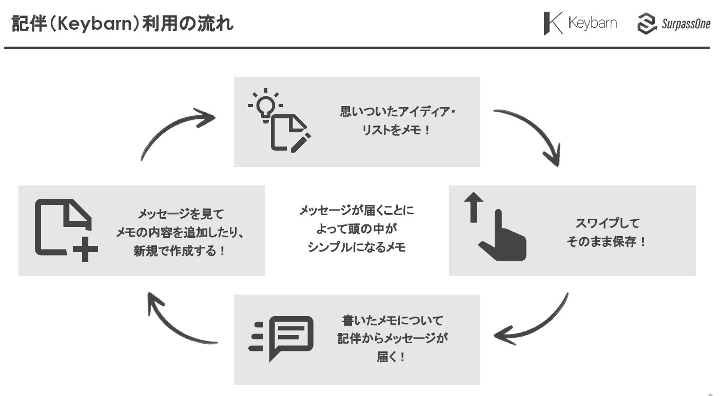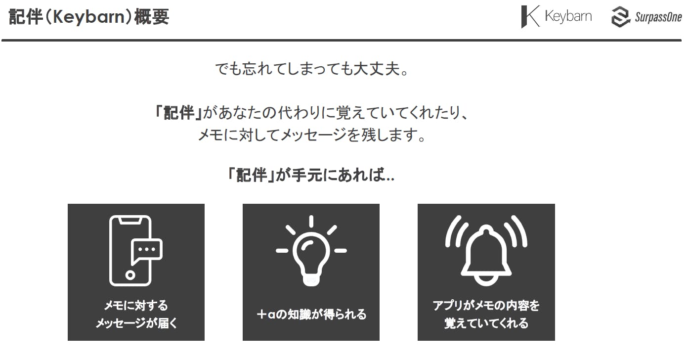 そして、完成したKeybarn(記伴)を利用いただくことで、忘れてはいけないことや大事な約束をうっかり忘れてしまう、アイデアがまとまらない、頭の中が整理できない、そんな悩みを解消して、アプリを利用いただく方の日常生活やビジネスシーンであなたのお役に立つことが本プロジェクトの目的です!