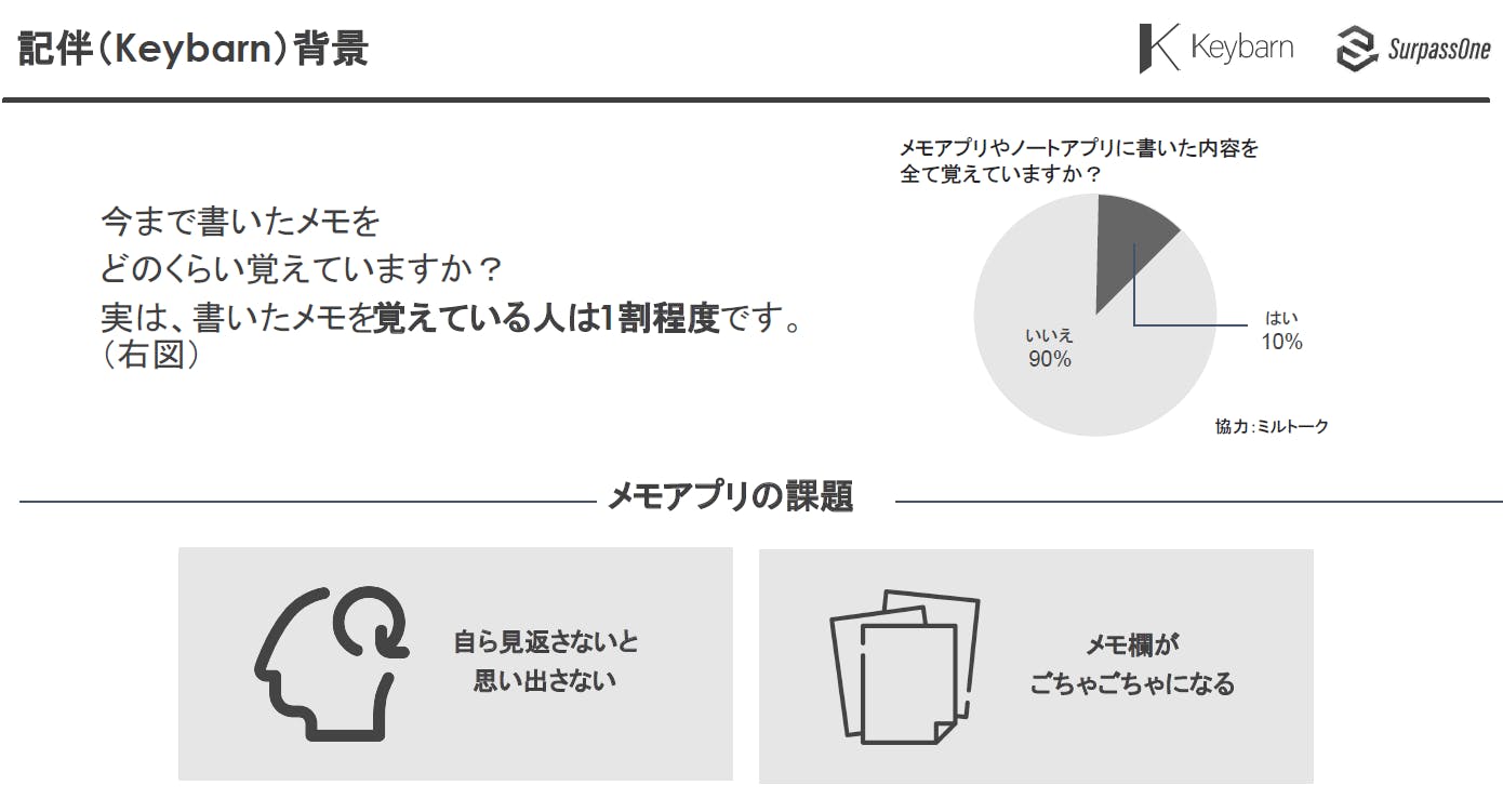 実はメモアプリやノートアプリに書いた内容を覚えている人は全体の1割程度です。従来のメモアプリには、「自らメモを見返さないと思い出さない」、「書いたメモ欄がごちゃごちゃになる」という課題があります。
