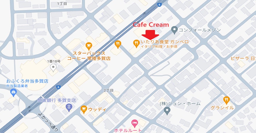国道6号線から 常陸多賀駅の看板が見えてきたら十字路を右折(よかっぺ通り)。