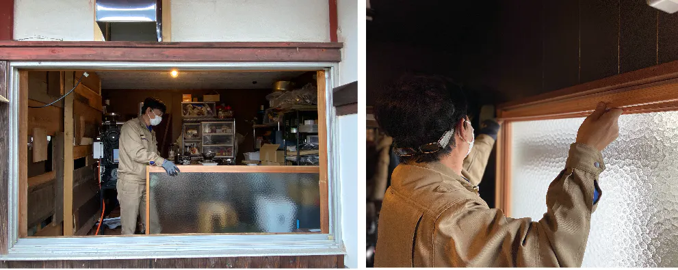 たまたま山元さんの工房に残っていた大きな一枚ガラスがちょうどいいサイズだということで、なんと現在は生産中止となっている貴重な模様ガラスを提供してくださり、見事な窓が実現しました。