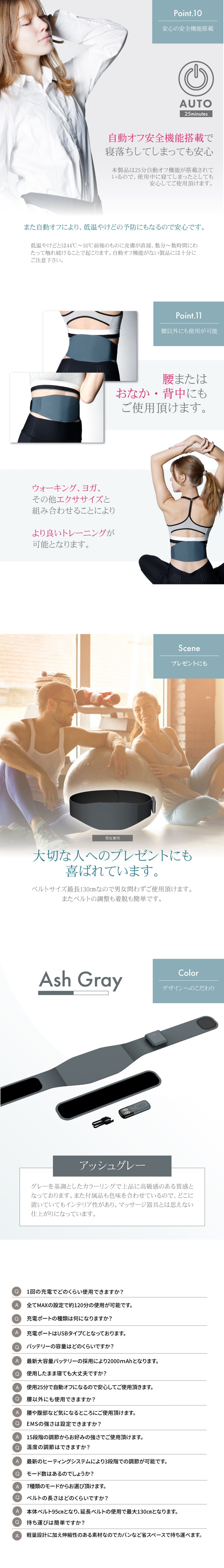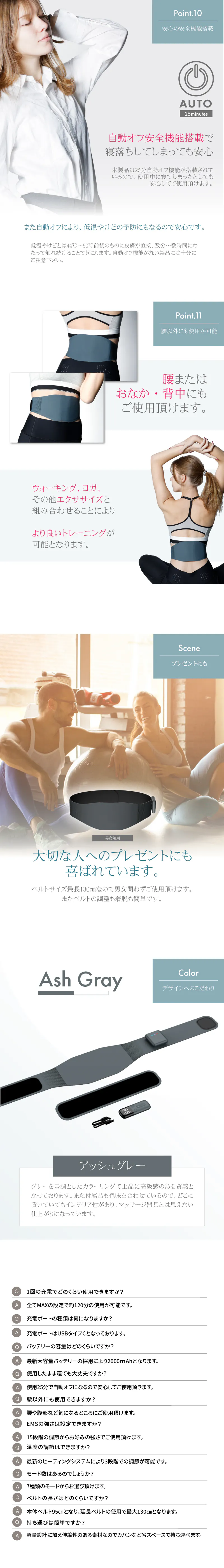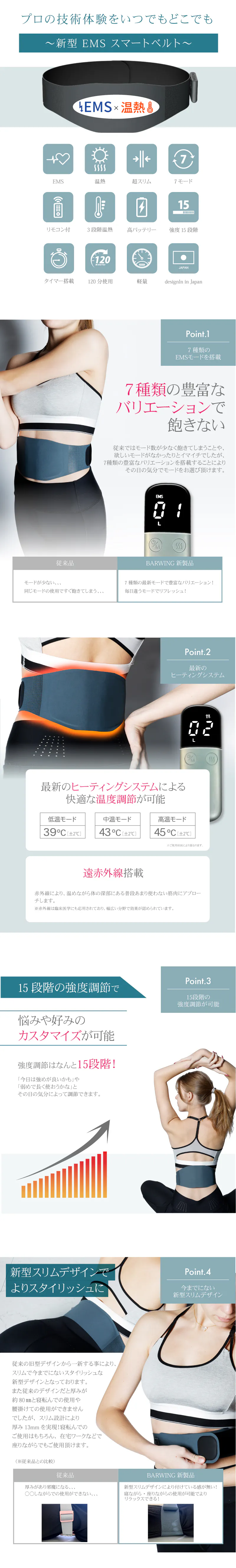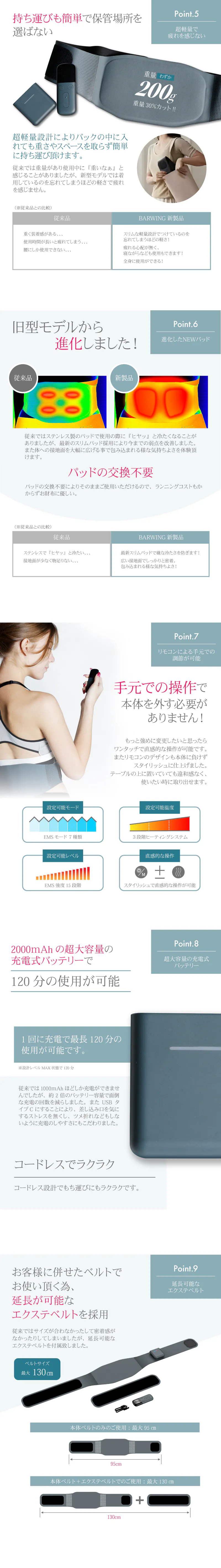 使用方法:使用したい部位(腰、腹部、脚など)の肌に直接取り付け、電源を入れる。リモコンでの操作が可能。