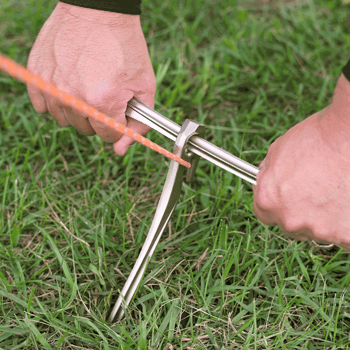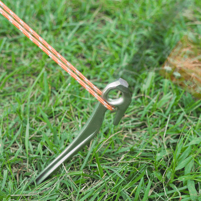 ペグをもう一本用意し、地面に刺さっているペグの穴に通します。通したペグをハンドル代わりにし、左右に少し回転させ地中で密着したペグをゆるめて引き抜きます。