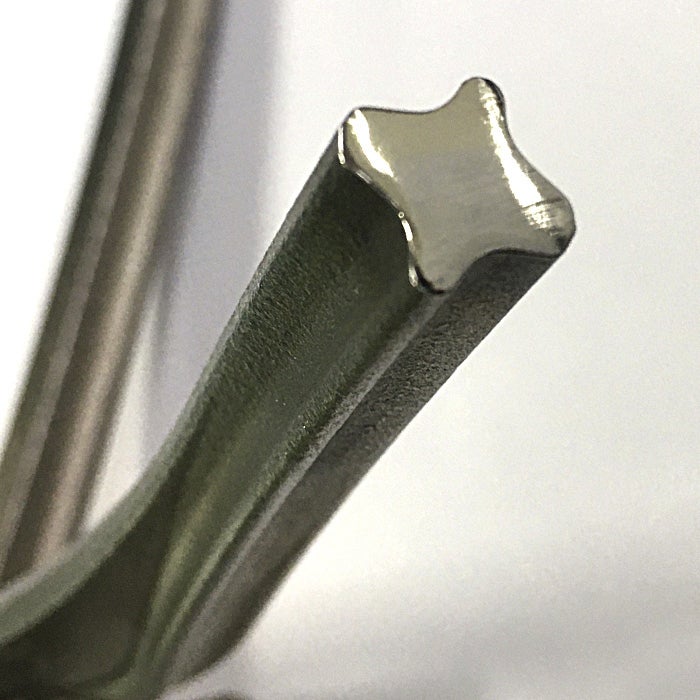 ❶素材は最も多く流通している一般的なステンレスに、ニッケル含有量を増やし、レアメタルであるモリブデンを添加し耐食を高めたSCS14を使用しています。地中に刺さる部分は先細りで、くさびのように土砂を押しのけて刺さります。また、断面を十字にすることで、軽量化しながら強度を高め地中での接地面積を大きくすることで抜けにくさに寄与しています。