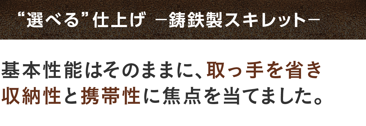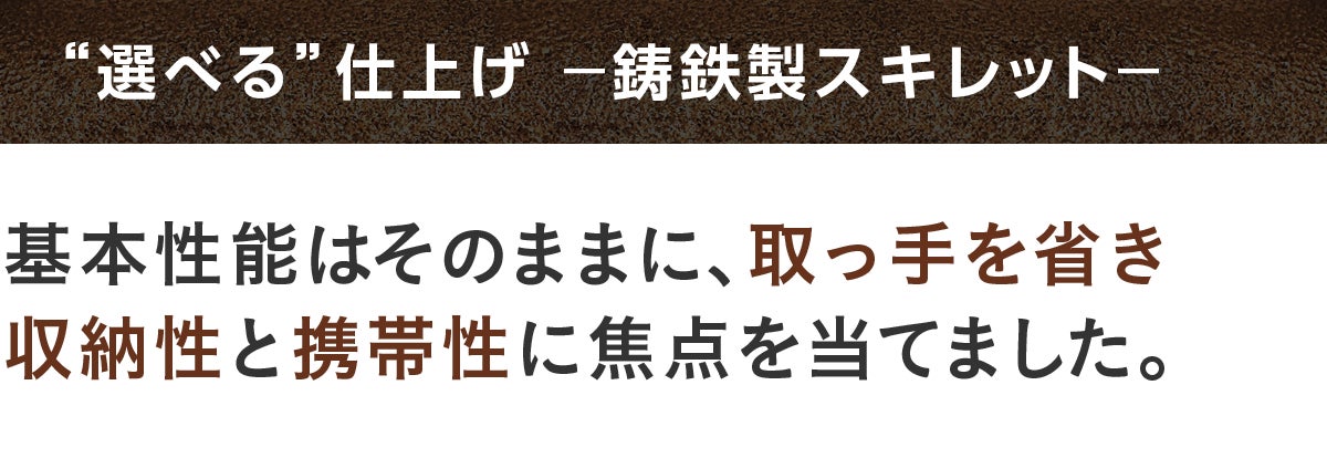 一般的に、スキレットはハンドルも鋳造されたものを指します。しかし、その固定概念を破り、本当にキャンプで使用したいスキレットを設計し製造いたしました。ハンドルの省略により、軽量化と収納性が向上し、屋内での利用も容易になりました。さらに、鍋肌の仕上げも3つの選択肢からお選びいただけ、無骨さからスタイリッシュさまで演出が可能です。