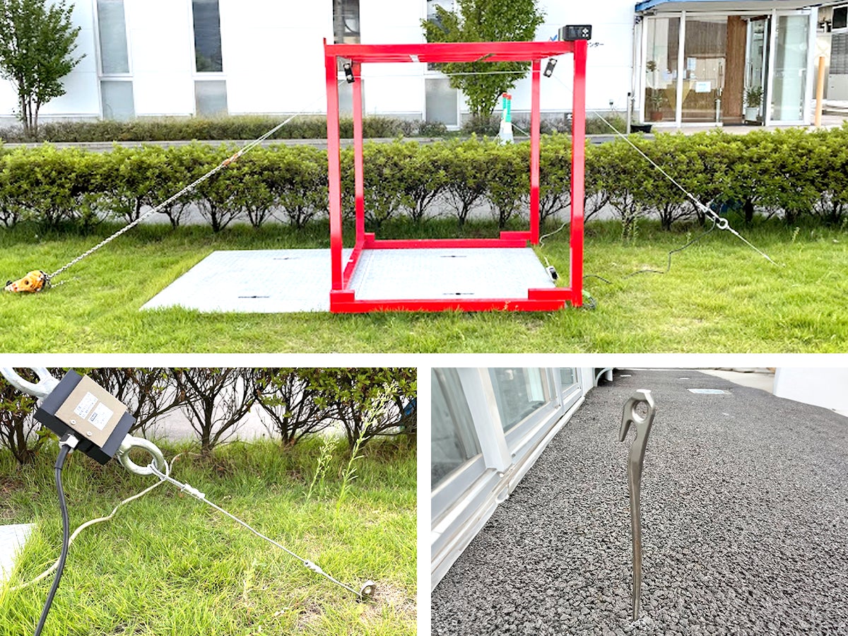 試験装置を設置した芝生へ銅屋ペグを打ち込みおよそ45°になるようにワイヤーを取り付け、レバーブロックによりペグが抜けるまで徐々にワイヤーに張力を加えたとき、荷重測定器でペグが抜出すまでのピーク張力(荷重)を確認しました。