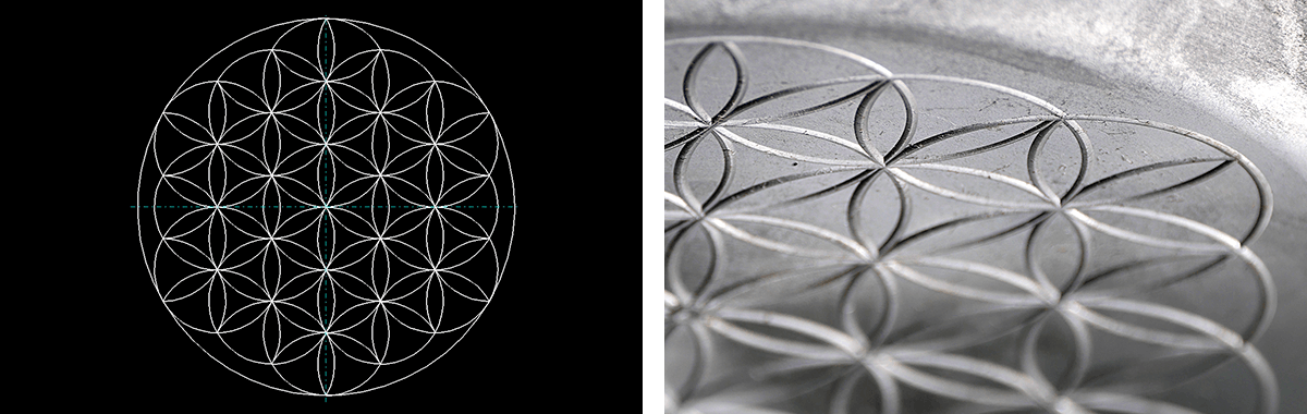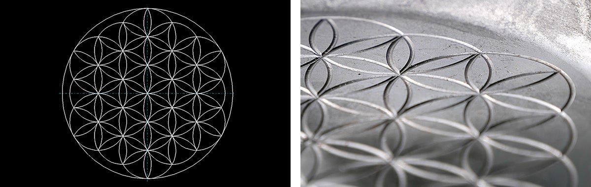 日常的に使って頂く調理器具として、油溝の機能を有しこげつきにくい特性を持たせつつ、日々の生活に彩を添えられるよう、古くから取り入れられてきた幾何学模様である“フラワーオブライフ”を模した文様を彫り込みました。