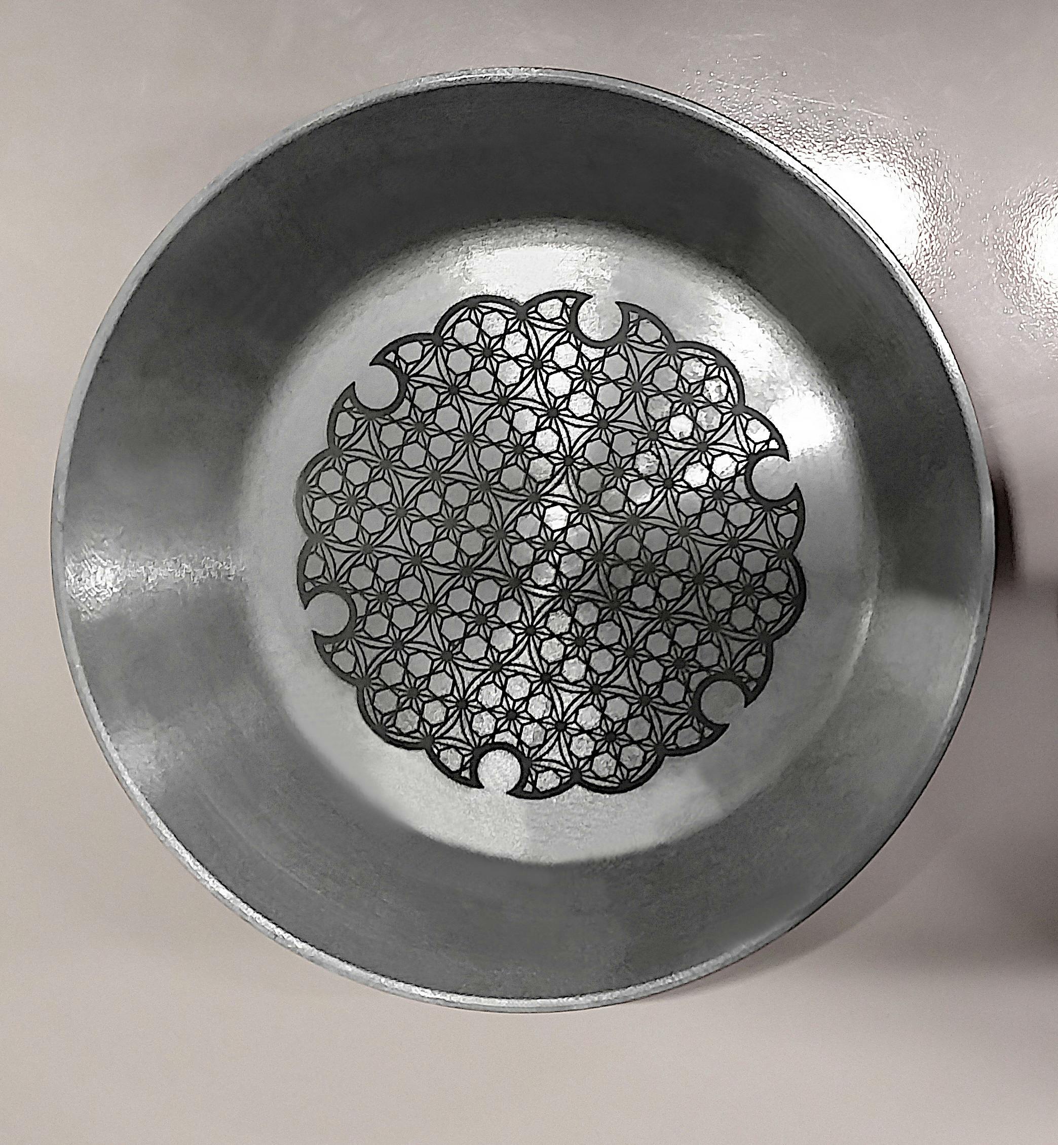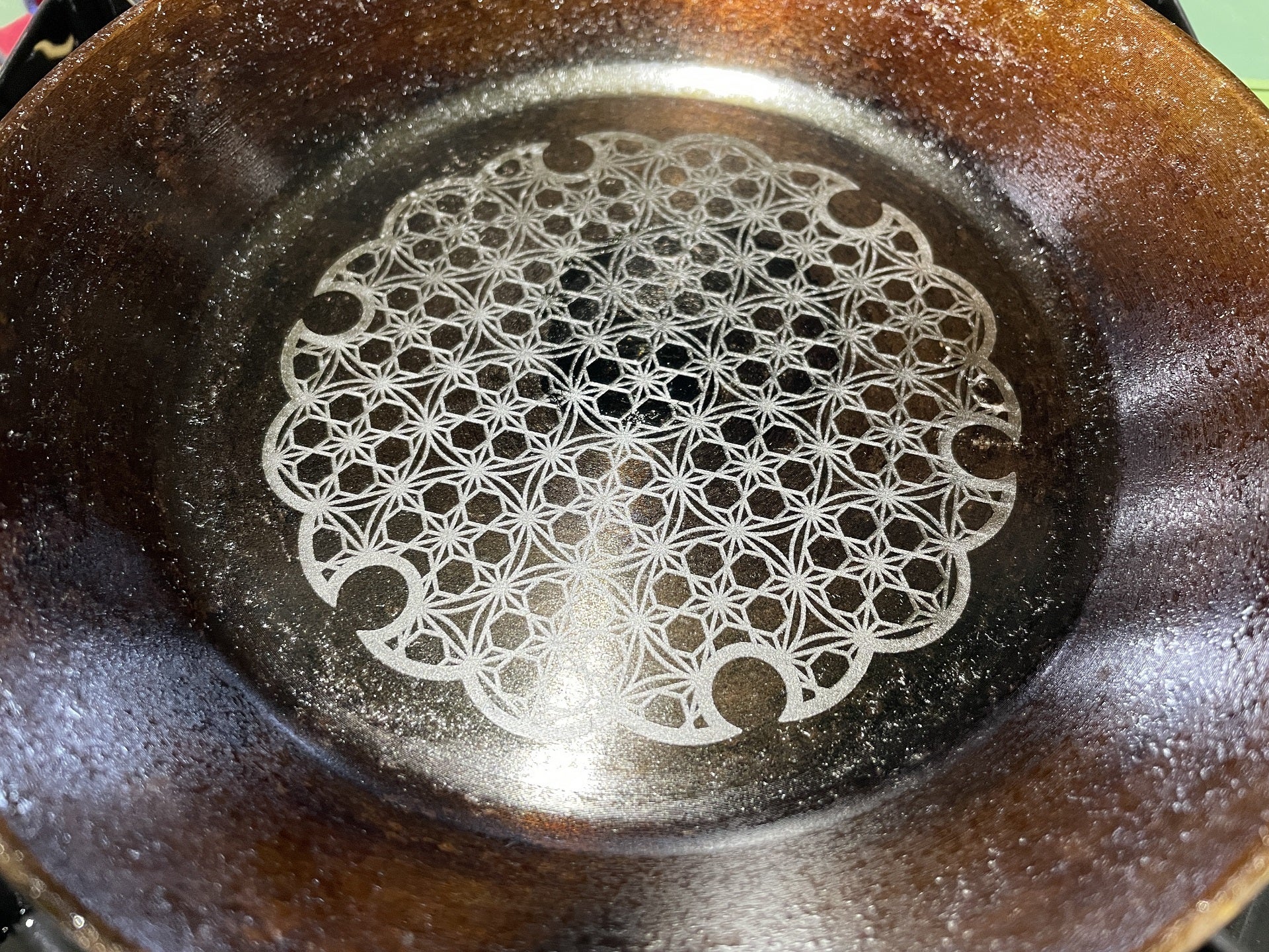 既存のスキレットミラー加工に、当社所有のレーザー刻印機で幾何学模様を刻印いたしました。