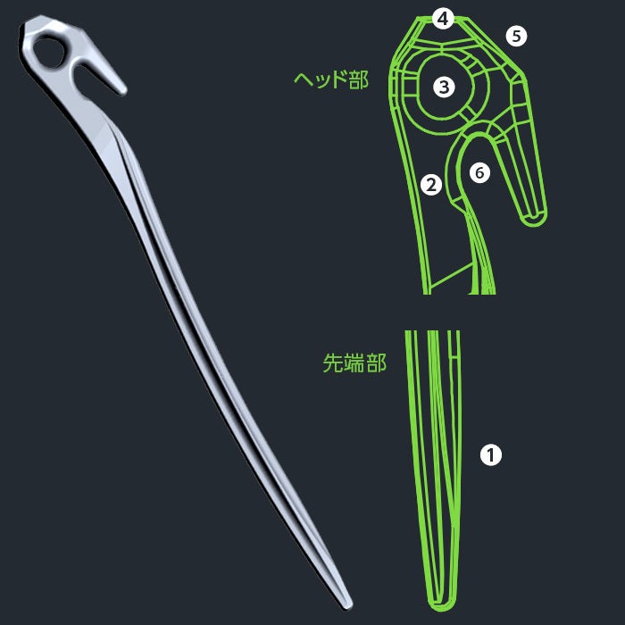 ❹ペグの頭部はわずかに球面状になっています。ハンマーがペグの頭部に当たる際にペグの中心を打撃しやすくなるように設計しています。