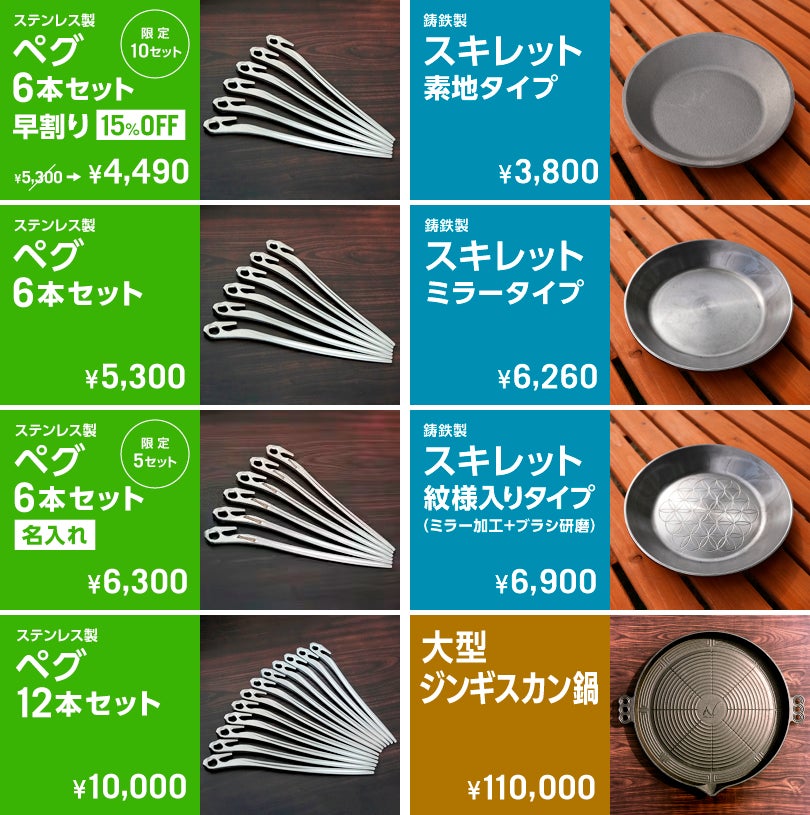 追加リターンのレーザー刻印の紋様入りスキレットはもちろん、従来からのリターンのペグもさらに支援していただいていただいております。ありがとうございます。