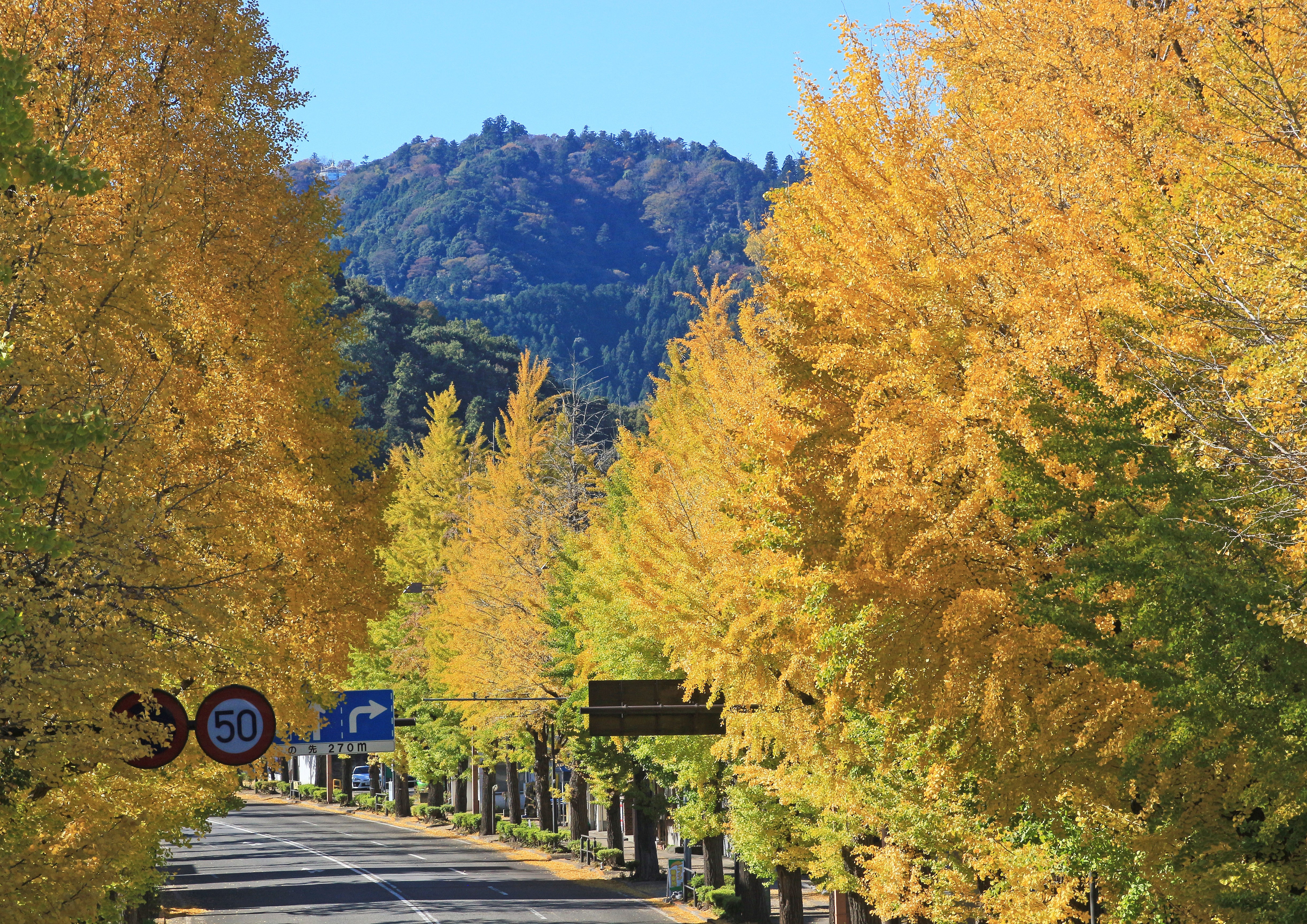 昭和2年から4年にかけて、八王子市追分町交差点から高尾駅入口まで、約5.5kmにわたる甲州街道(国道20号)の両側に、大正天皇陵造営の記念樹として約770本のいちょうの木が植樹されました。以来、季節に応じてそれぞれの風景で街を彩り、秋になると特に美しく黄葉し、道行く人の目を楽しませてくれています。