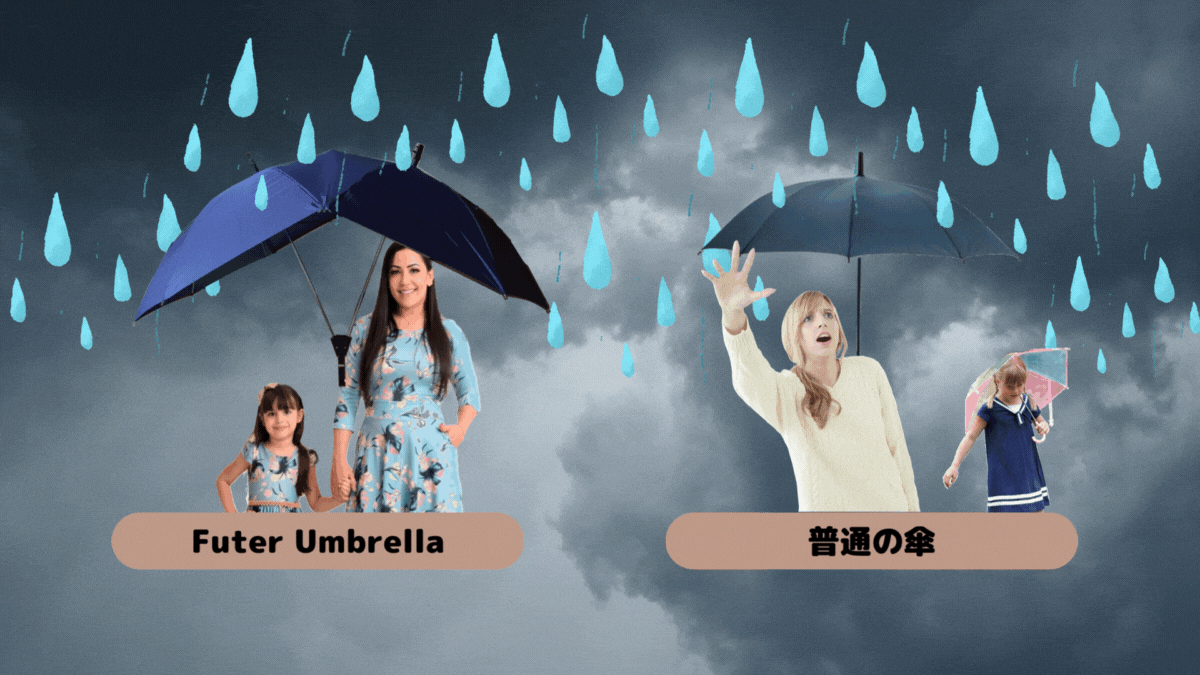 「Future Umbrella」 があれば お散歩中急な雨 お子さんを濡れないように傘を・・自分はずぶ濡れ・・なーんてことはなくなります。 あなたもお子様も雨から守ります。