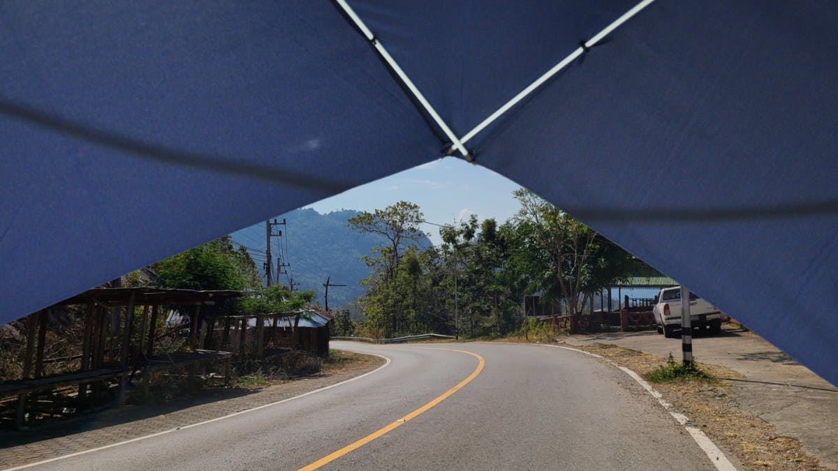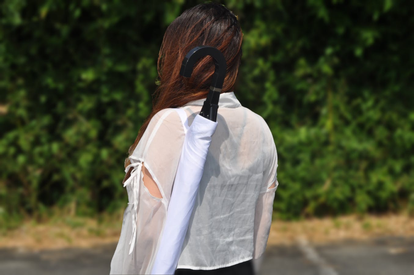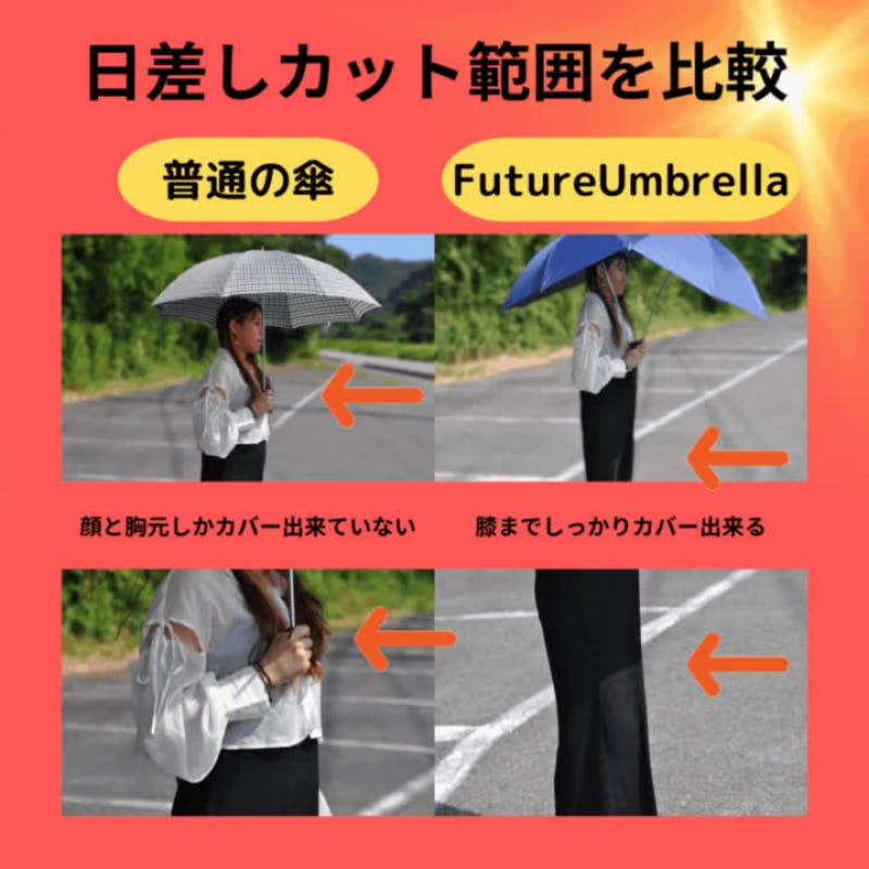普通の傘では傘を持つ手より下はカバー出来てません。それに比べ「Futer Umbrella」は、膝までしっかり日差しを遮っています。