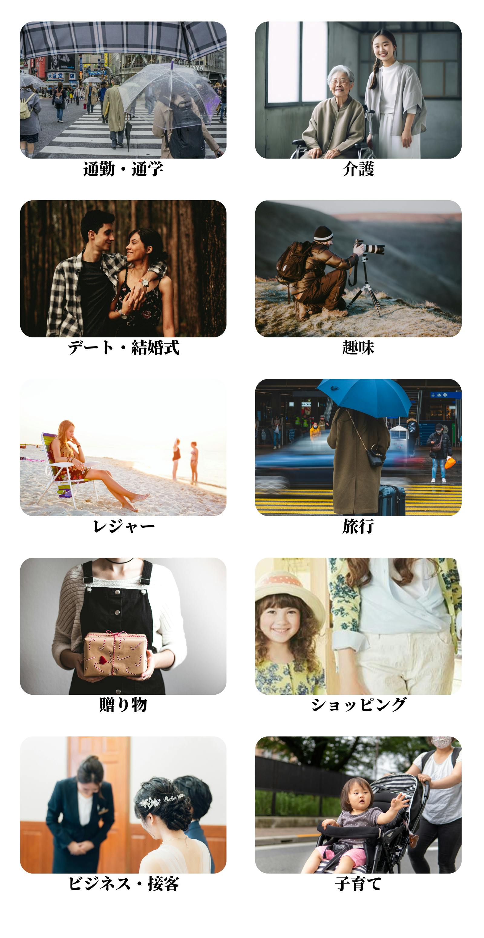 通勤 通学 レジャー 趣味 介護 日常生活 贈り物 万一の災害時 結婚式 ペット 数えればきりがないですが、皆様の生活にきっとお役に立てると思います。
