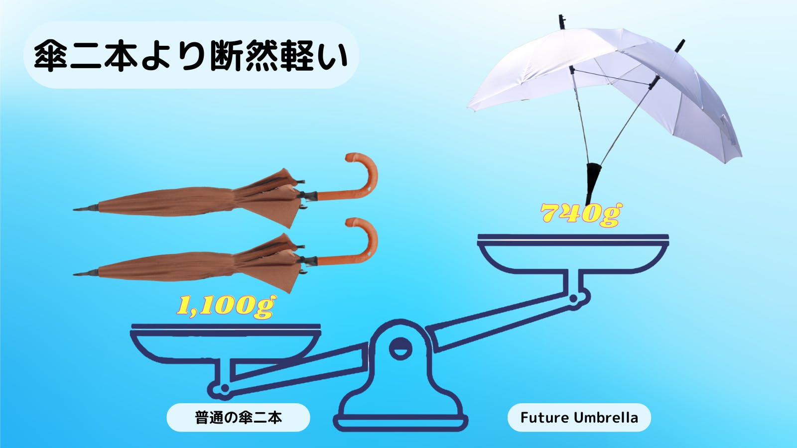 傘の重量は、デザイン等によりますが 一般的に紳士傘は2本で約1100g、婦人傘は約900g、ビニール傘は約800gと言われています。「Future Umbrella」は740gとビニール傘2本より軽いのです。