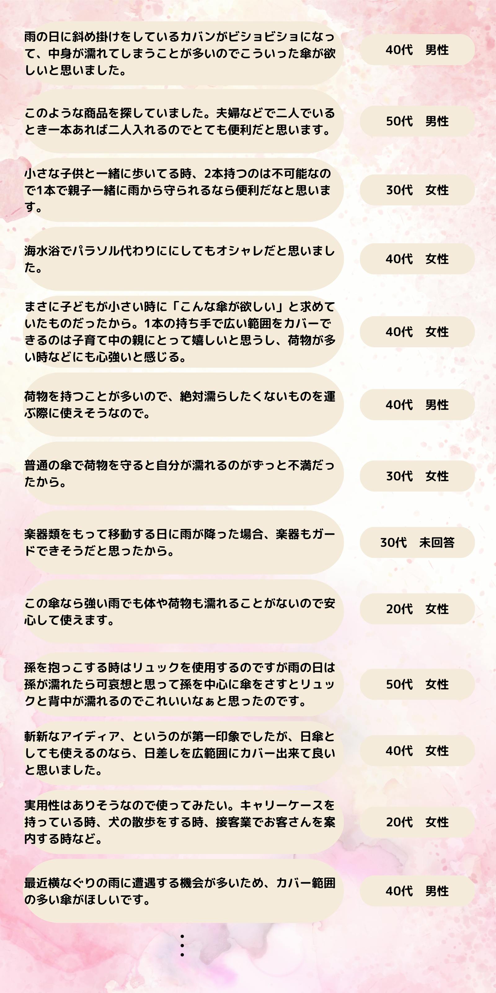 そこで。これがあれば一人でも二人でも使用することが出来る大きな傘、しかもゴルフ場のような広い場所ではなく普通の生活シーンでも邪魔にならない傘がないものかと考えていました。