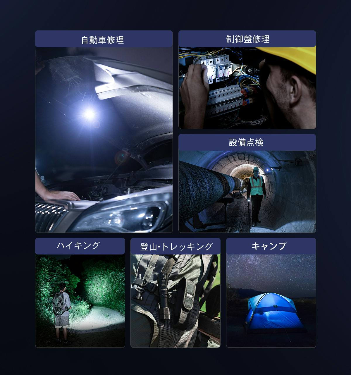 今回の懐中電灯は【働きを支える】【生活を楽しむ】をコンセプトにご紹介したい商品となっております。建設現場で遠くや近くを照らす現場での使用や、キャンプや登山で複数で歩く時に足元を照らし遠くも照らす。今までにない懐中電灯です。