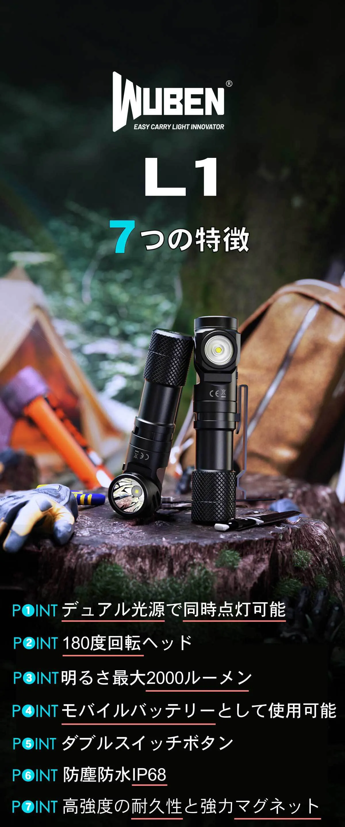 このライトが一つあれば日常生活からキャンプ、アウトドア、防犯、災害時の備えにもなり、自信をもってお勧めします。実用性が有り、緊急時にも役に立つ【WUBEN L1】を皆様にお届け出来るのを楽しみにしております。是非一生もののお供としてあなたの側に置いていただけたら幸いです。精一杯プロジェクトに取り組んで参ります。皆様からの応援を心よりお待ちしております。