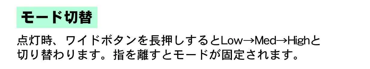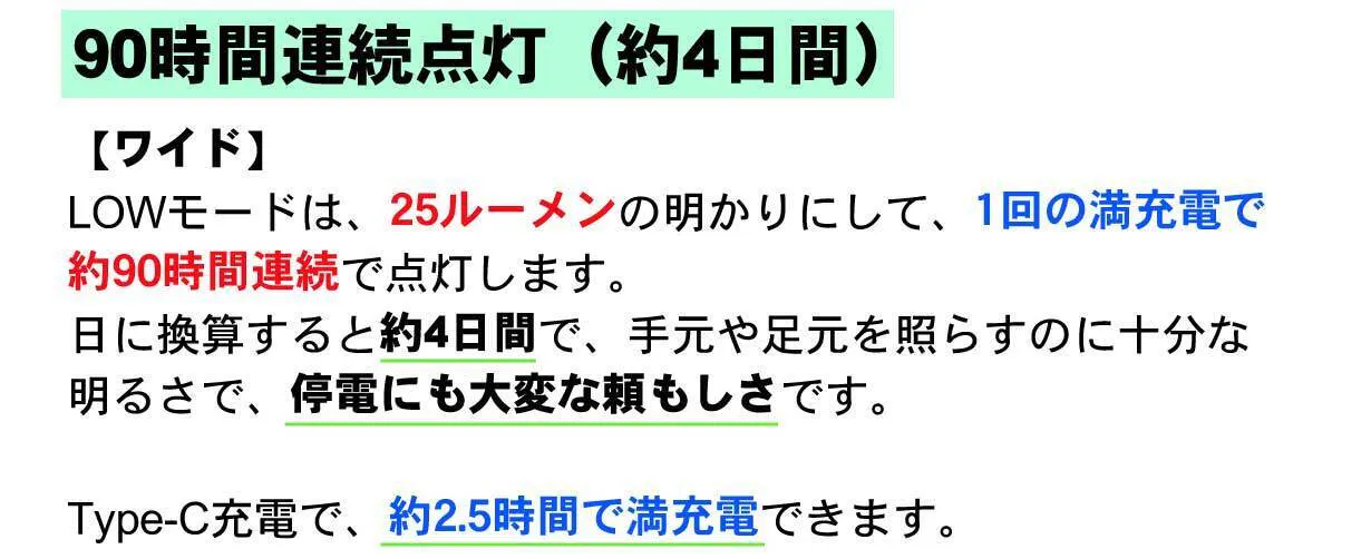 【ワイド】High:30秒+6.5時間 ・Med:7時間 ・Low:90時間