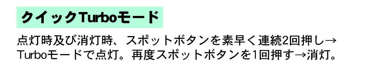 A:【スポット】Turbo:30秒 +7時間 ・High:30秒+8.5時間 ・Med:9時間 ・Low:60時間