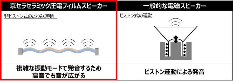 京セラはファインセラミック技術の圧電性という特性を使用して古くは、圧電体と金属板を組み合わせた警告音を鳴らす圧電ブザーを作っておりました。その後、圧電技術を応用してインクジェットプリンタのインク吐出駆動デバイス(プリントヘッド)や自動車部品向けの燃料噴射インジェクター用のピエゾ素子を現在も製造販売しており、それらの製品開発で培った圧電材料や設計技術をベースに、圧電素子とフィルム、フレームを最適に組み合わせることで、圧電素子の振動がフィルムへ伝わり、面全体が振動して音を増幅する構造を開発しました。