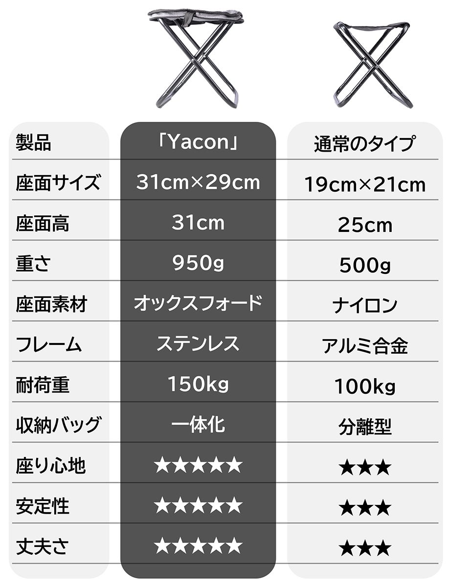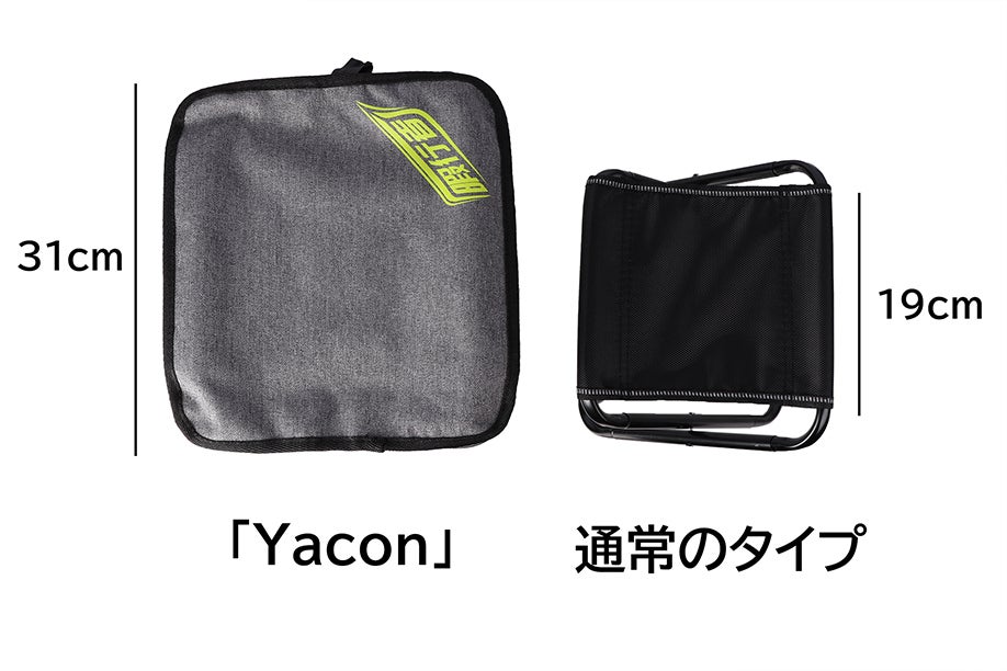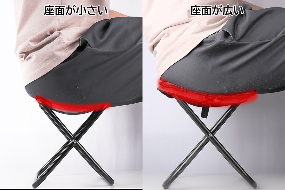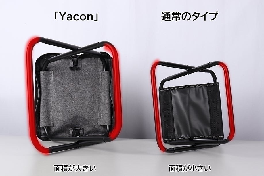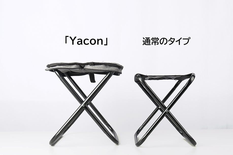 通常の折りたたみ椅子と比べ、「Yacon」の座面の面積が50%以上広く、面積が大きいほど圧力分散効果がよく、座り心地もより快適。