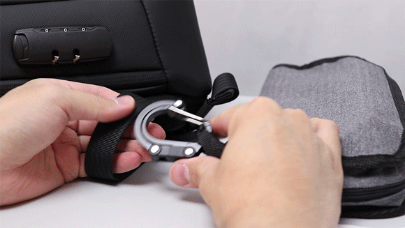 ストラップの一端に多機能カラビナが付いているため、リュックにかけて使用できて、リュックと一緒にテーブルに固定することもできます。