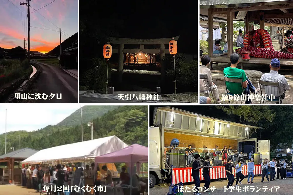 年1回のほたるコンサートには毎年多くの方々にお越しいただき、学生のボランティアが頑張ってくれています。毎月2回開催の「むくむく市」という野菜市と屋台村を天引住民で運営して8年目になります。