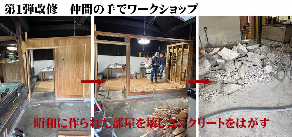 2022年夏頃に譲り受けてから手続きなどを経て10月頃からワークショップとしてみなさんにお手伝いいただきながら、片付け、改修を始めました。