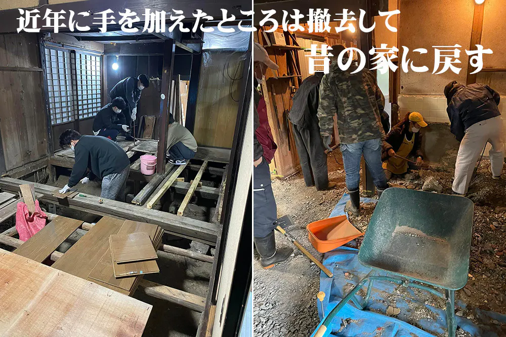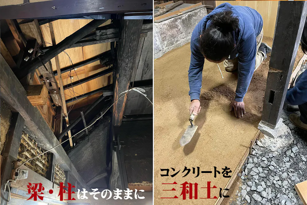 皆がイメージするおじいちゃん、おばあちゃんの田舎の家にするには、近年にリフォームしたところのコンクリートなどを撤去、解体して、昔のカタチに戻すように柱や梁、煤で真っ黒な壁は大切に残すようにしました。