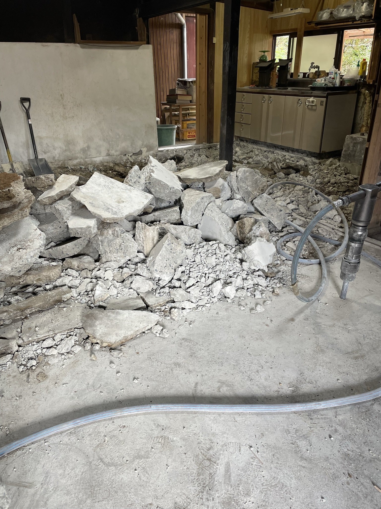 「天引村倶楽部」をつくる!空き家になっている所を貸していただけないかといろいろお願いしていたら、「天引のためになるならどうぞ」と快く譲っていただける家がありました。そこは100年以上を経た茅葺きの立派な古民家です。この家を見たときに、リフォームされていたのですが、おじいちゃん、おばあちゃんの家に遊びに来たような懐かしい感じがしました。2022年夏頃に譲り受けて10月頃からワークショップとしてみなさんにお手伝いいただきながら、片付け、改修を始めました。皆がイメージするおじいちゃん、おばあちゃんの田舎の家にするには、近年にリフォームしたところのコンクリートなどを撤去、解体して、昔のカタチに戻すように柱や梁、煤で真っ黒な壁は大切に残すようにしました。