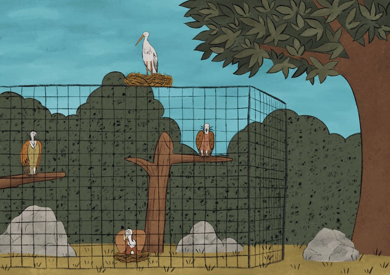 ラバト動物園のハゲタカの檻と、その上に営巣するコウノトリ現在私が暮らすモロッコでは、街中でゴミをつつくのはカラスではなく白く優雅なコサギ、そしてコウノトリが人間の生活圏でも多く営巣しています。「はげたかの旅」は、2018年に初めてモロッコを訪れた際、首都ラバトでまず息子と訪れた動物園で見た、ハゲタカの檻の上にコウノトリが巣を作るという光景から着想したものです。自由を奪われる鳥、自由を謳歌する鳥がすぐ隣り合わせで、悲哀と皮肉を感じました。