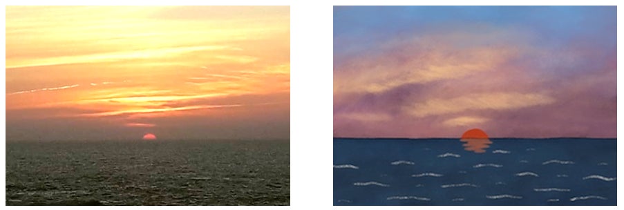 大西洋に沈むマグレブの夕日(写真(左)と、Lolliの挿絵)。お天道様はここから太平洋に向かい、日本で再び朝日となります。