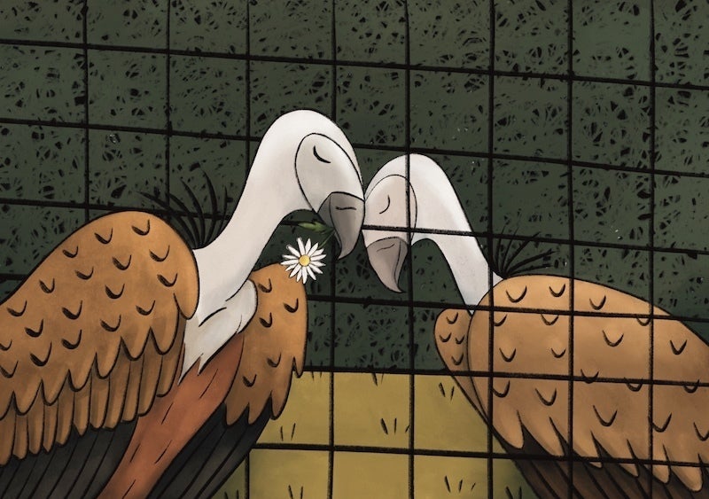そして長い旅の後アニルは母親の待つ動物園に戻り、やはり檻の中に暮らす女の子ハゲタカのララと恋に落ちます…(つづきは絵本を読んで頂ける方へのお楽しみ)。
