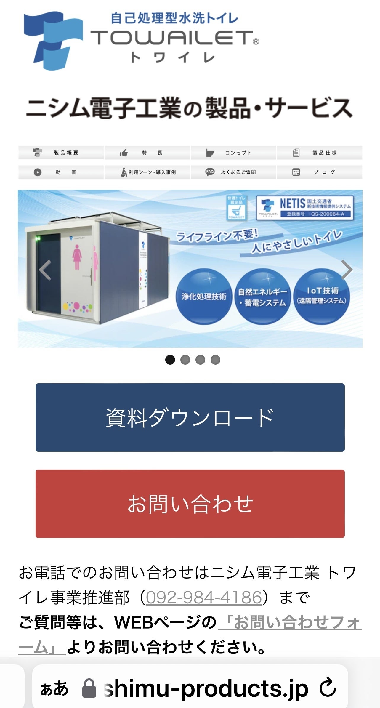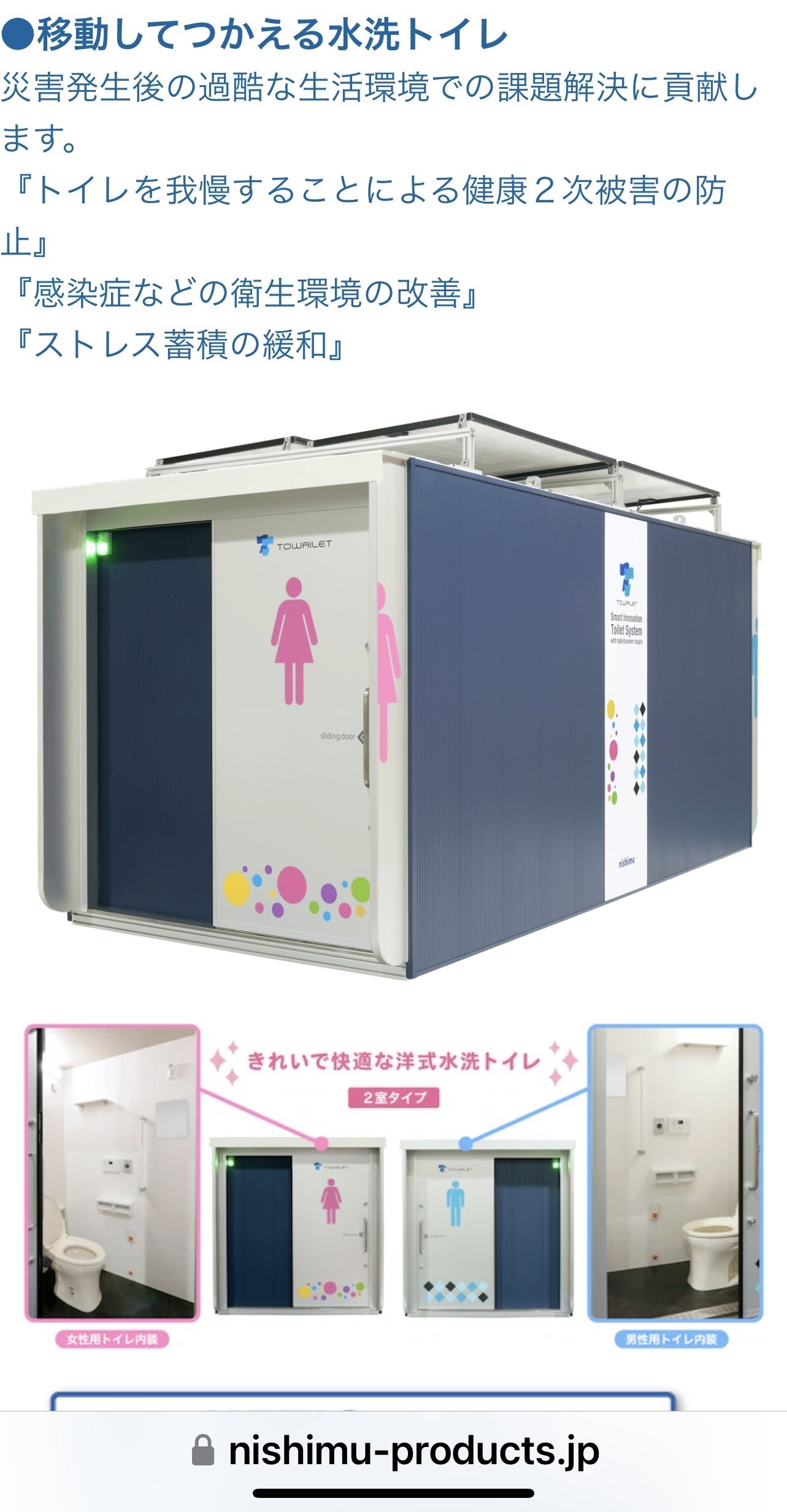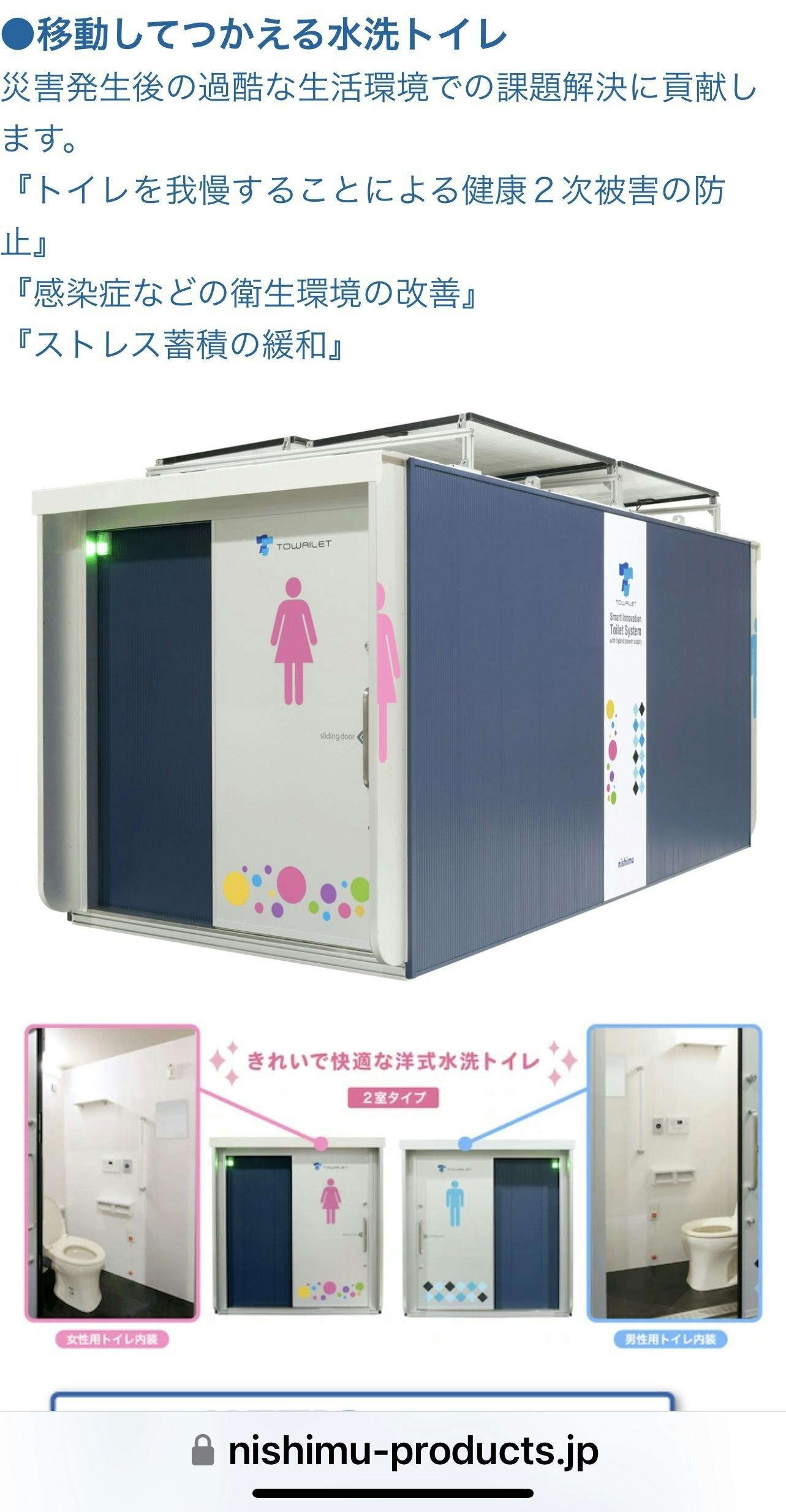 「自己処理型水洗トイレ TOWAILET(トワイレ)」開発のきっかけ: TOWAILET(トワイレ)の開発は、東日本大震災をきっかけに始まりました。 被災地で救護活動に従事されている熊本赤十字病院さま、九州電力総合研究所さまが、 被災地の深刻なトイレ事情を憂慮され、「重大な二次疾患や感染症の拡大を防ぐため、電気や水道などの生活インフラが寸断した場所でも、平常時と同じように衛生的に 使えるトイレ」を構想されたのが始まりです。その構想を引き継ぎ、 商用電源がない場所でも使用するための「太陽光発電+蓄電池による独立電源」や、 トイレ内各機器の動作を制御する「シーケンス制御」、トイレの利用状況や機器の 稼働状態を遠隔地で監視するための「IoT」等、当社が長年培ってきた技術を 活用して、開発に携わることになりました。「持続可能な開発目標(SDGs)」達成への貢献:TOWAILET(トワイレ)は、国際連合が掲げている、2030年に向けて世界が合意した「持続可能な開発目標SDGs)」の達成に貢献しています。