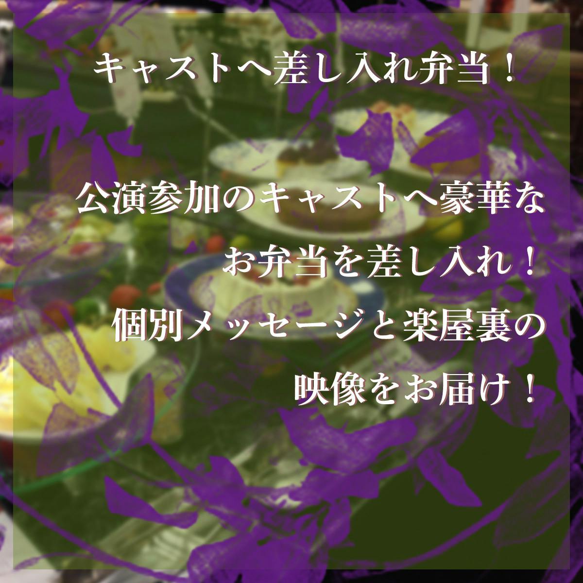 指定した役者に豪華なお弁当を差し入れすることができます! お弁当を食べている姿を撮影し、個別のメッセージと共に楽屋裏の様子を捉えた動画を送信します