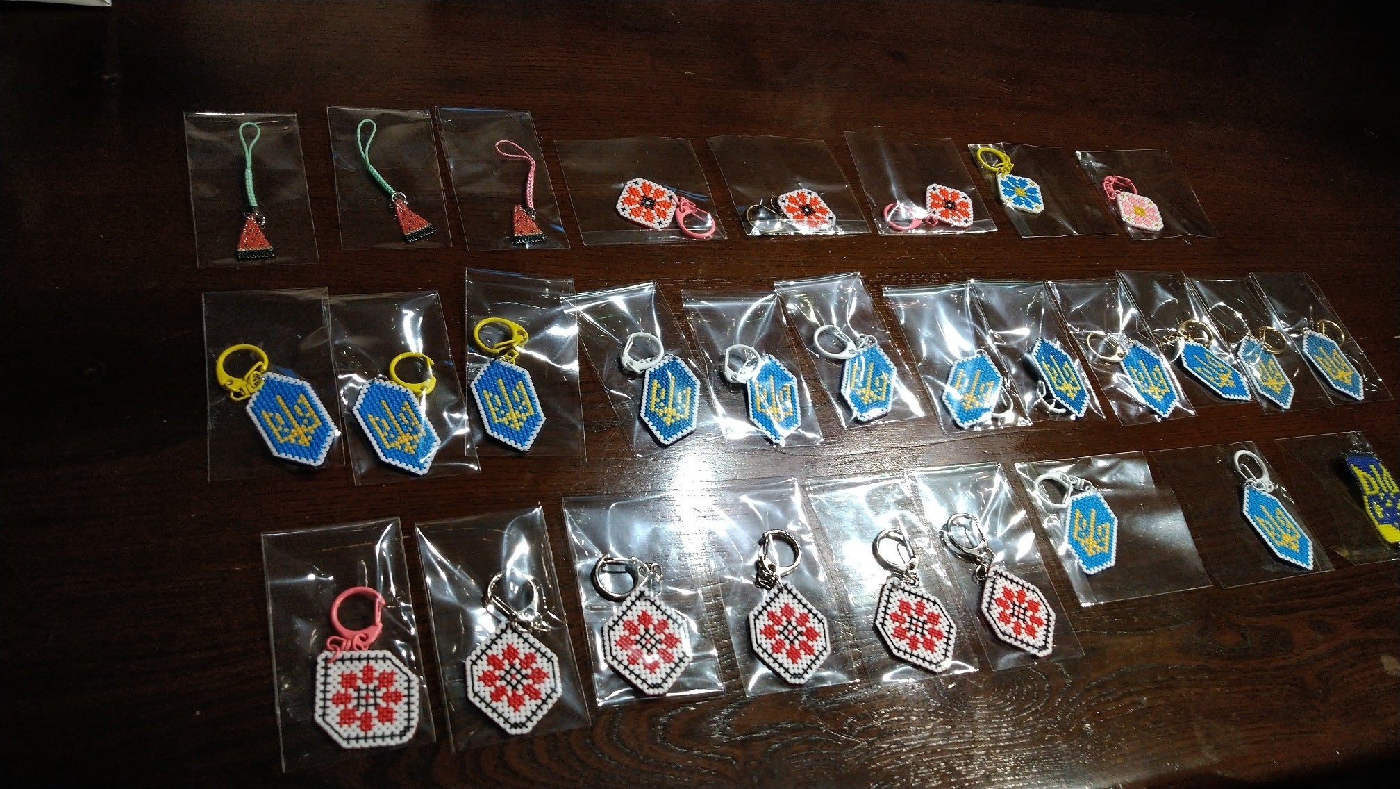 昨日は「ウクライナ語で学ぶフラメンコダンス」のレッスンがあった。病気や仕事で来られない人が多い日だったが、このところ切れ目がなかった私のバタバタも一段落したので、久々レッスンを行うことにしたのだ。会場はいつものスタジオがとれなかったため、エルスール財団記念館のカフェになった。レッスンでは、12月23日(土)の『クリスマスフラメンコライブ&パーティー』のオープニングに予定している曲を振付けた。4分強の曲だが、ウクライナ人生徒たちの集中力が高く、1回のレッスンで振付終了。次回からはどんどんブラッシュアップしていく予定だ。レッスン後はいつものようにお茶とお菓子を楽しみながら、ウクライナ避難民が出演するライブの第一部のプログラムの相談をした。決まったのは、歌が2曲、踊りが3曲だ。(意欲的!)そして、こちらは昨日イーラさんが持って来てくださったウクライナ刺繍のキーホルダーと根付。すべてお母さまによる手作りだ。かつてウクライナ人のほとんどの女性はウクライナ刺繍ができたそうだが、今はこれほどの刺繡をできる女性は減っているそうだ。ちなみに、刺繡糸によるものとビーズによるものがある。これらは、クラウドファンディング「ウクライナ避難民のレクリエーション支援」のリターンのひとつになっている。クラウドファンディング終了まであと2週間。1000円からのご支援が可能ですので、ぜひ引き続きのご支援よろしくお願いいたします!なお、これらのキーホルダーなどは、「クリスマスフラメンコライブ&パーティー」の際にも販売いたしますので、ご来場いただける方はぜひお手にとってご覧ください。私は昨日、早速スイカのビーズの根付を購入しました。(←これ、カワイイです!)
