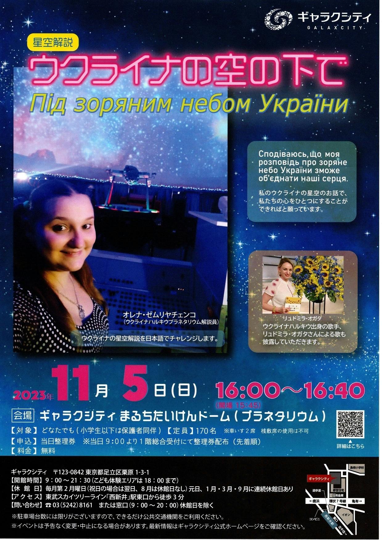 彼女は、昨年4月にハルキウからご家族といっしょに日本に避難されました。「ハルキウで7年もやっていたプラネタリウム解説員のお仕事をもう日本ではできない」と思っていたそうですが、紹介者が現れ、また新聞・雑誌・テレビなどでも紹介され、次々とお仕事ができるようになりました。そのあたりのお話が10月22日(日)にテレビのドキュメンタリーで紹介されました。