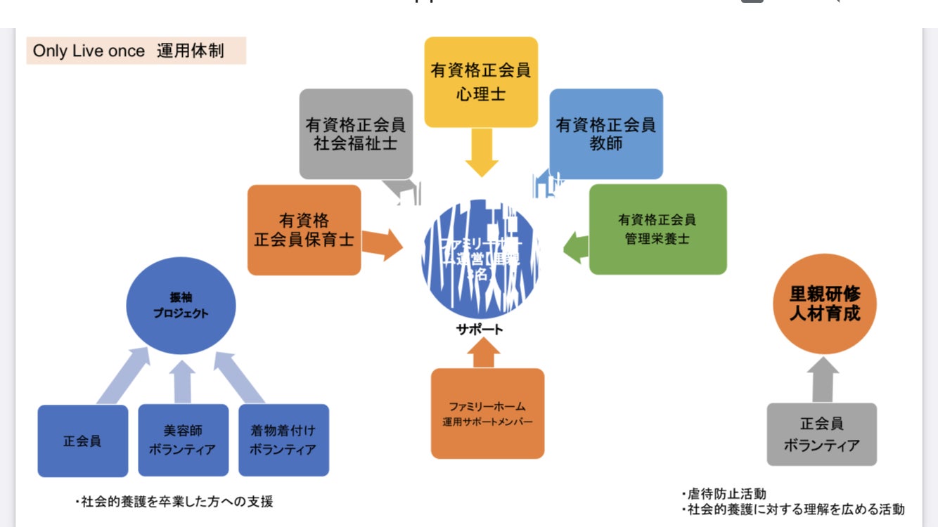 令和4年3月に発足した特定非営利活動法人Only Live Onceは社会的養護の子ども達と社会的養護を卒業した若者を支援することを主な目的とした団体です。