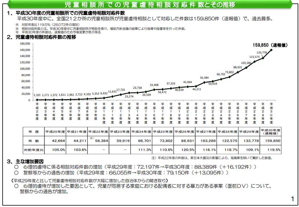 相談窓口ができたことで、今まで明るみに出なかった虐待の相談が増えたという見方ももちろんできますが、ここ数年は右肩上がりで増加しています。